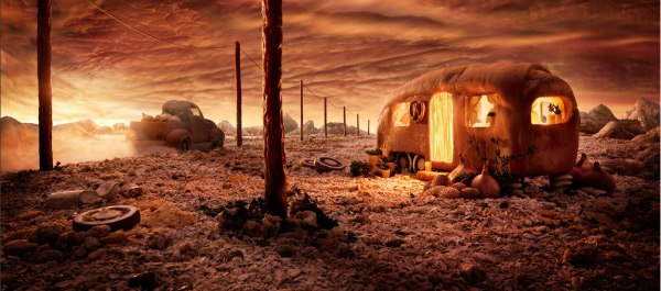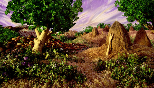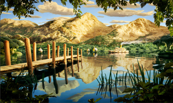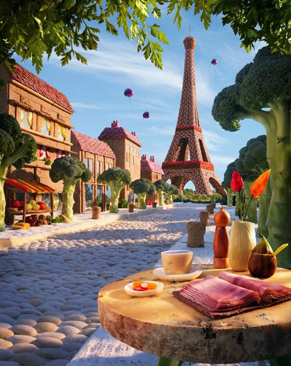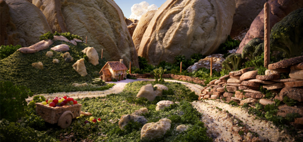 Na série “Foodscape”, Carl Warner desenha paisagens convencionais, usando técnicas clássicas de composição, para facilitar a ilusão do espectador de ser uma imagem real à primeira vista. “Depois de alguns segundos, o observador tem a constatação de que a cena é feita de alimento e inevitavelmente, soltam um belo sorriso. Esta, para mim, é a melhor parte”.
